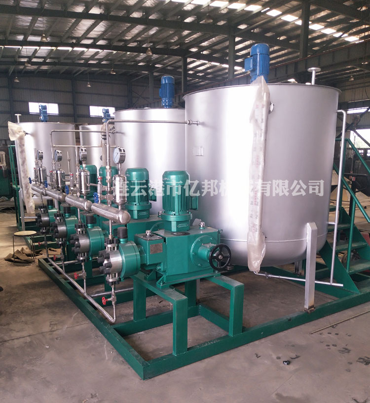加藥裝置組成結構有:溶液箱、液位計、計量箱、攪拌器、加藥計量泵、安全閥、壓力表、控制柜、閥門以及管路集中布置,各部件的材質主要分不銹鋼和碳鋼襯膠。